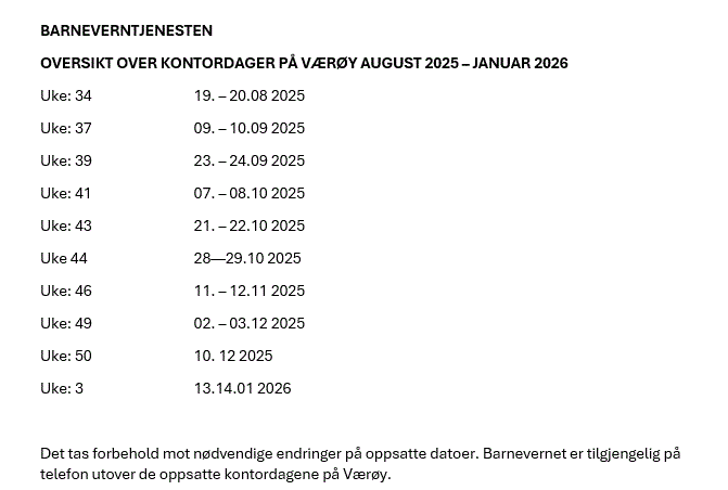 Barnevernet - kontordager på VærøyHer finner du en oversikt over kontordagene til barnevernet på Værøy i 2025 Kontaktpersoner:Maren FinstadMob: 90 52 48 95E-post: maren.finstad@bodo.kommune.noBjørg HansenMob: 95 87 22 09E-post: bjorg.hansen@varoy.kommune.noBesøksadresse i Bodø: Prinsensgate 113 A BodøBesøksadresse på Værøy: Det norske husPostadresse: Barnevernstjenesten i Bodø Postboks 903 8001 BodøTelefon barnevernets ekspedisjon: 75 55 55 40Telefontid: 10.00-14.00Besøkstid: 08.00-15.30Barnevernsvakta: 99 54 15 00 (tilgjengelig hele døgnet, også helg og høytid). E-post: barnevernet@bodo.kommune.noAnnen kontaktAlarmtelefonen for barn og unge 116 111 (gratis)BarnevernBekymringsmelding og meldeplikt til barnevernetTips politiet Sist endret 22.10.2025 14.20